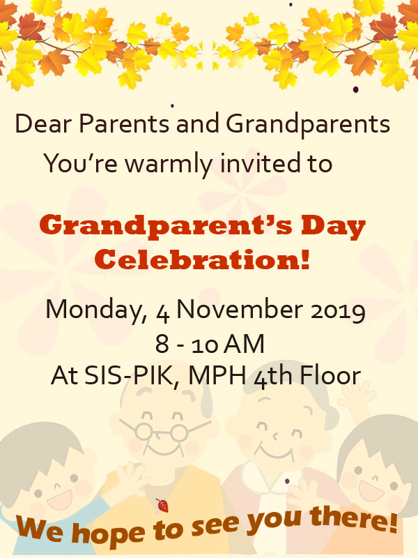 On Monday, 4 November 2019, we will be celebrating Grandparent’s Day at SIS-PIK. It is a special day for us to show appreciation to our beloved grandparents. We would like to welcome all of the SIS-PIK community to share this occasion with us from 8:00 am onwards.