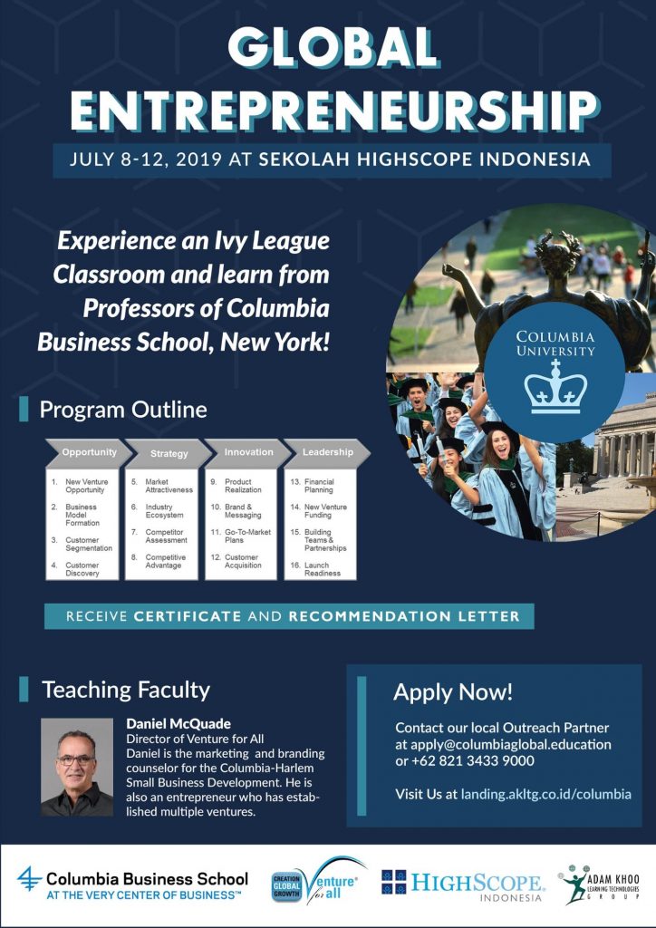 哥伦比亚商学院正在提供全球创业计划。纽约常春藤联盟大学哥伦比亚商学院的丹尼尔麦克奎德教授将教高中生如何在5天内创造他们独特的创意。在课程结束时,学生将收到证书和推荐信。