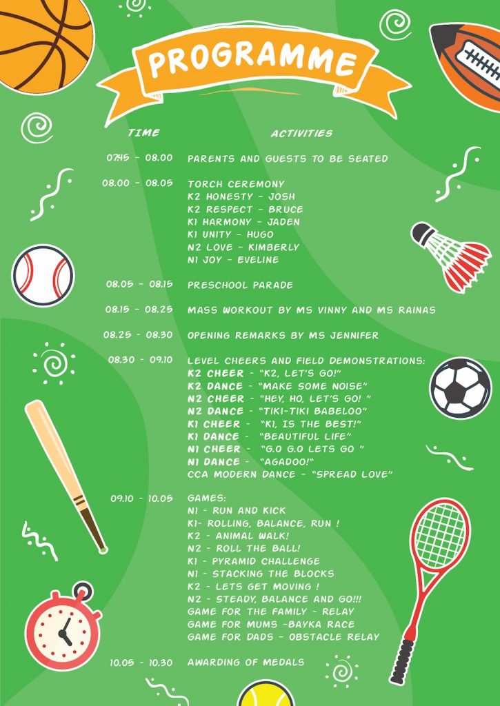 Acara Open House akan dimulai dengan penuh semangat pada pukul 8 pagi ketika kita menyaksikan anak-anak Preschool kita berpartisipasi di Hari Olahraga Preschool. Acara ini selalu menjadi salah satu hari favorit kami di setiap tahun ajaran; melihat anak-anak penuh dengan tawa dan kegembiraan sangatlah istimewa bagi kita.