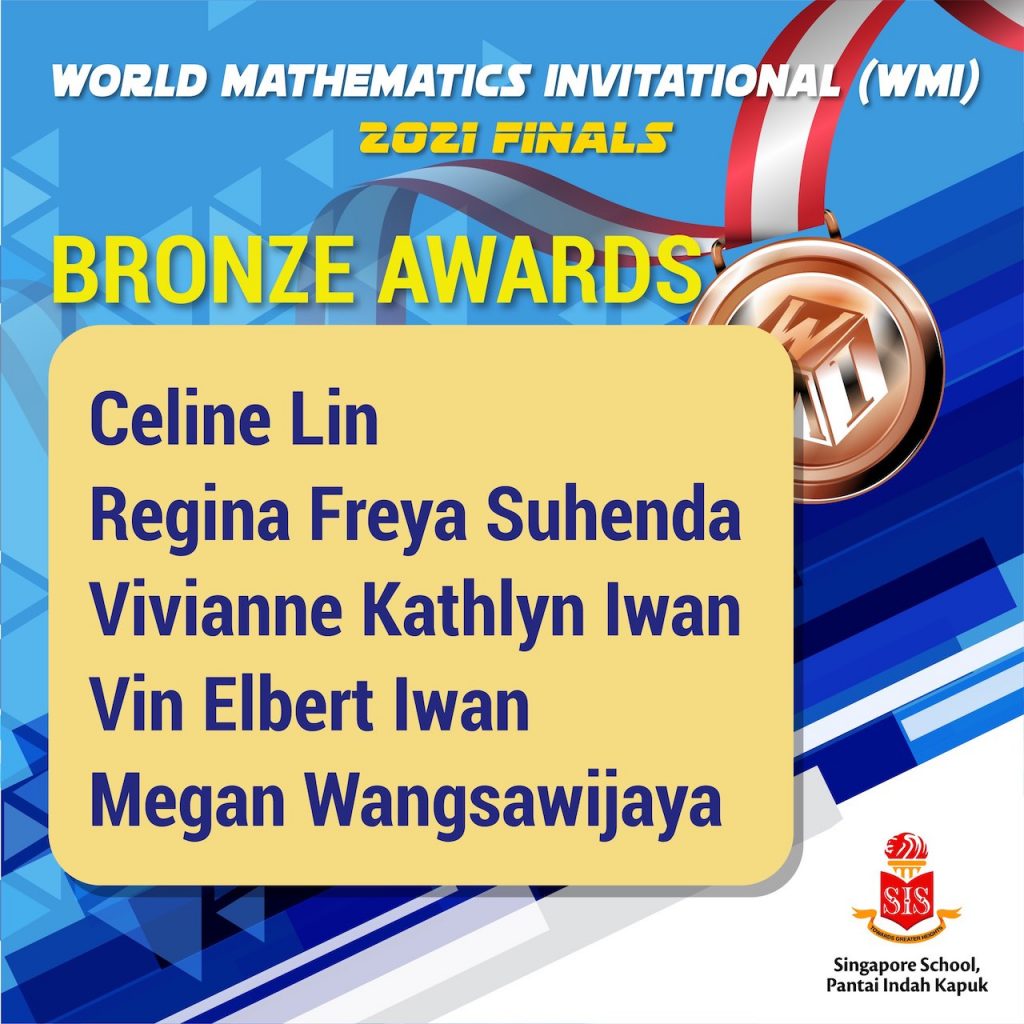We are proud to announce the winners of the World Mathematics Invitational (WMI) Finals 2021. Congratulations to all awardees and participants for bringing 14 awards home: 2 Diamond, 2 Gold, 2 Silver, 5 Bronze, and 3 Merit Awards.