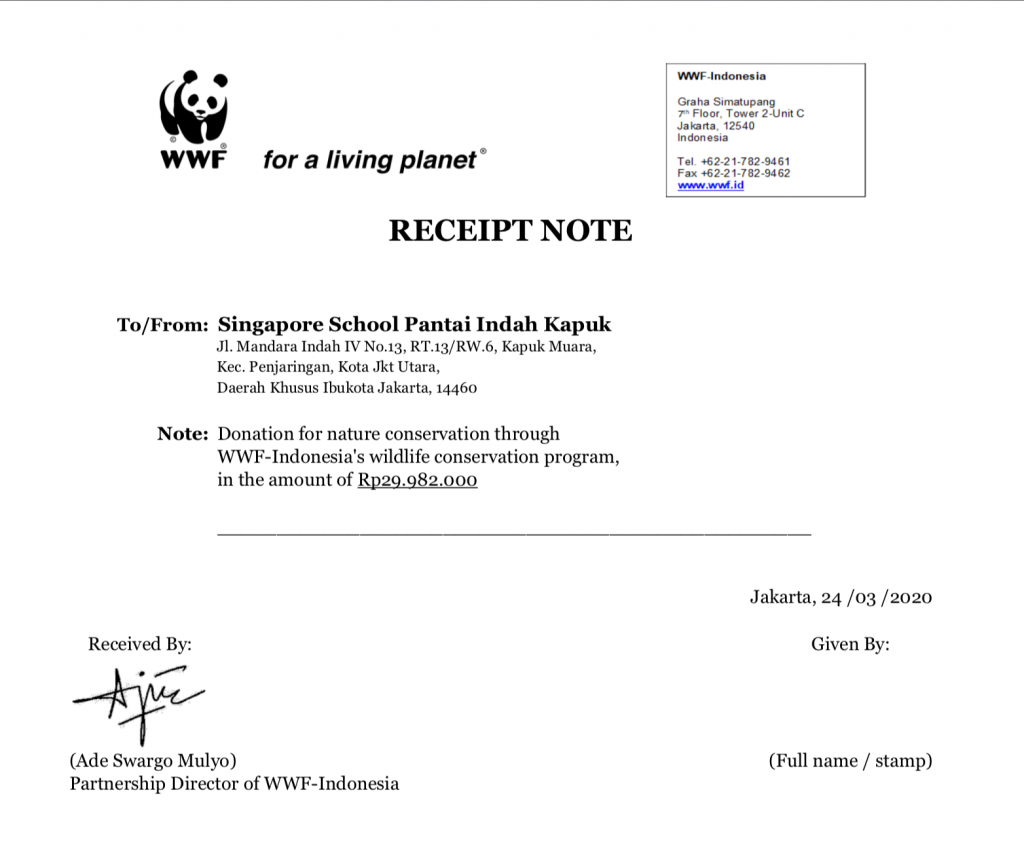 The school has now donated the money our P2 classes helped raise, at the Mini Bazaars, to the World Wildlife Fund (WWF) for nature, Indonesia. WWF-Indonesia has sent their sincere gratitude for P2’s generous contribution to the organisation. The amount we have given them will make a big difference as the proceeds will be delivered directly to support WWF – Indonesia’s wildlife conservation program.