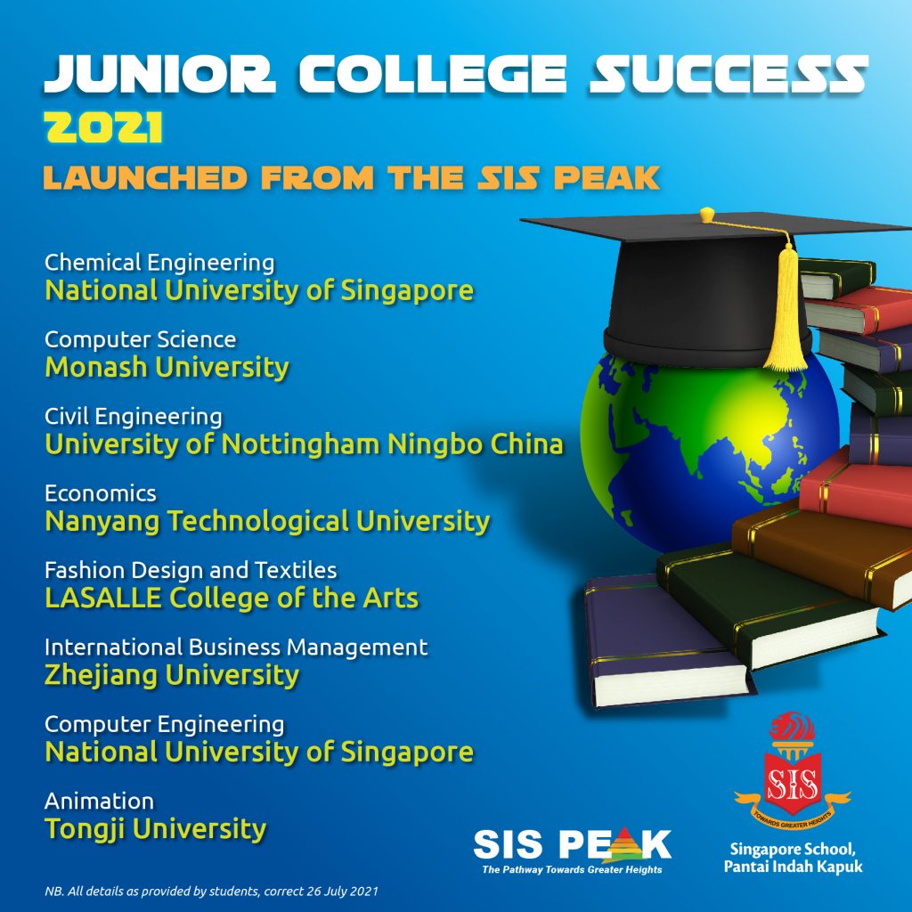 Semua siswa JC telah dilatih menulis CV, surat motivasi, dan pernyataan pribadi, dan JC2 kami sedang mengidentifikasi pilihan universitas impian, kecocokan, dan keamanan. Setiap minggu mereka mempunyai jadwal pelajaran dengan Mr Victor dan juga dapat mengatur sesi pribadi untuk dukungan individu lebih lanjut. Tujuan kami adalah bekerja-sama dengan siswa kami untuk membantu mereka mencapai aspirasi mereka, dari awal ‘Basecamp’ di Secondary 1, hingga ‘SIS Peak’ di JC2.