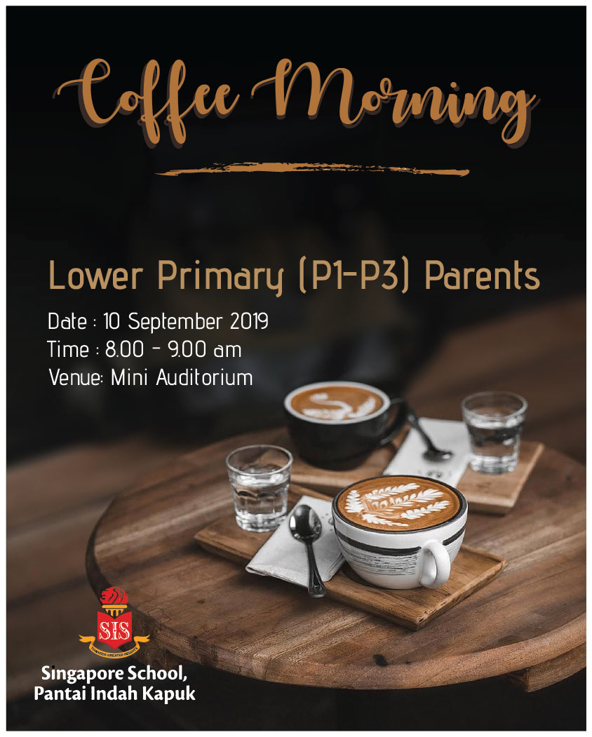 COFFEE MORNING FOR PRIMARY PARENTS We would like to invite Primary Parents to our Coffee Morning on : Date/TimeParentsAgenda10 September 20198:00 – 9:00 amLower Primary Parents (P1-P3)Field Trip