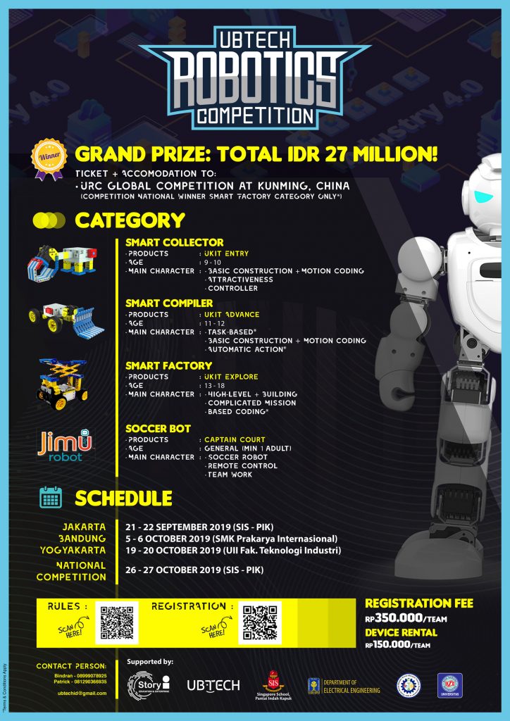 We are very pleased to announce that SIS-PIK in cooperation with UBTECH will be hosting a Robotics Competition at our school on 21-22 September 2019. UBTECH Robotics Competition (URC) is sponsored by UBTECH, and is aimed at encouraging students to explore different kinds of robots in an environment of AI technology. This competition is open to all students aged 9-18. Parents are also invited to join the Soccer Bot category if you want to team up with your child for this competition. We are very pleased to offer a very special registration fee for our SIS-PIK community who will join this competition, IDR150,000/team. Please note, each team will need to pay for the device rental of IDR150,000/team, except for the Soccer Bot category. There is no device rental fee for Soccer Bot category. Please see the attached poster for more details and scan the QR Code for rules and registrations.