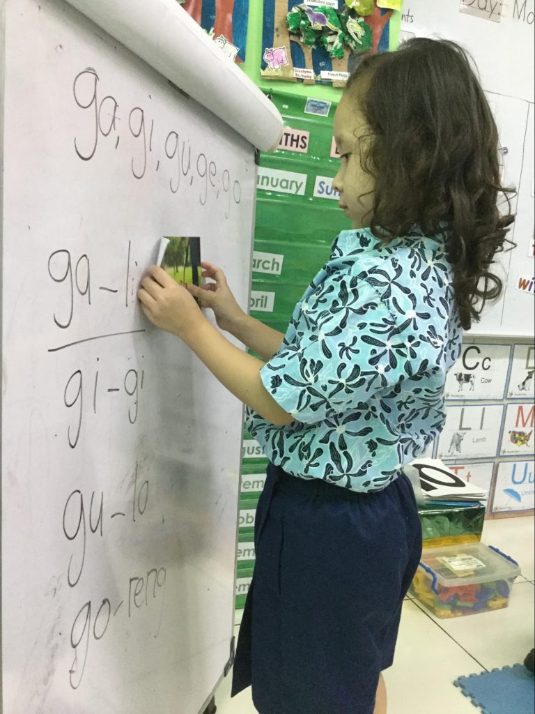 K1印度尼西亚语课 幼儿园K1印度尼西亚语课程 幼儿园的每个班级都必须为学生提供各种各样的活动,以便学生参与课程。这个学期,K1印度尼西亚语课专注于“ga,gi,gu,ge,go”等音节。学生很乐意根据老师所说的音节进行单词搜索。这项活动使他们理解并记住印尼语单词。