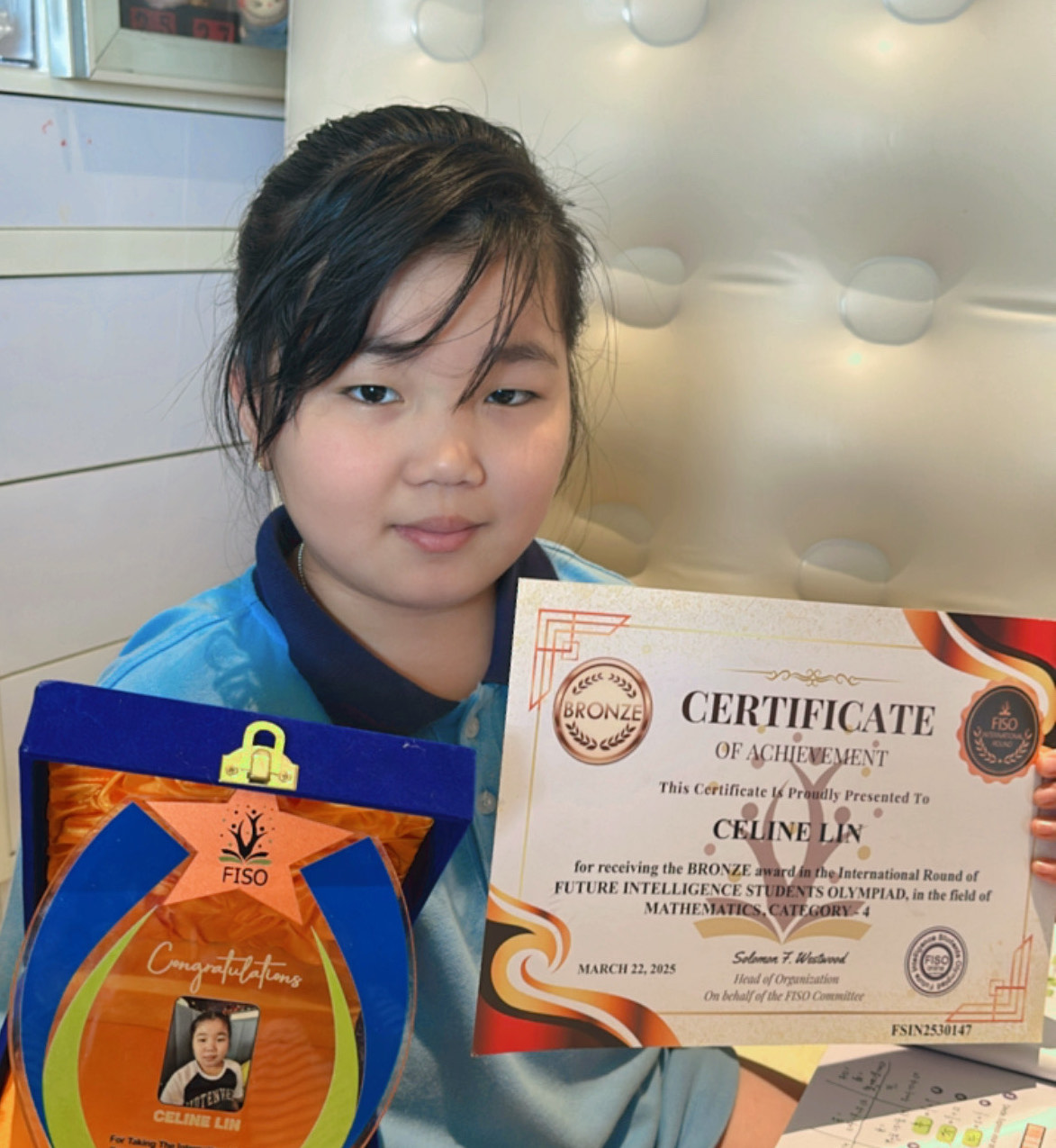 祝贺六年级A班的 Celine Lin 在未来智能学生奥林匹克数学国际赛(第4组别:五至六年级)中荣获铜奖!这是一个了不起的成就,Celine,祝贺你!